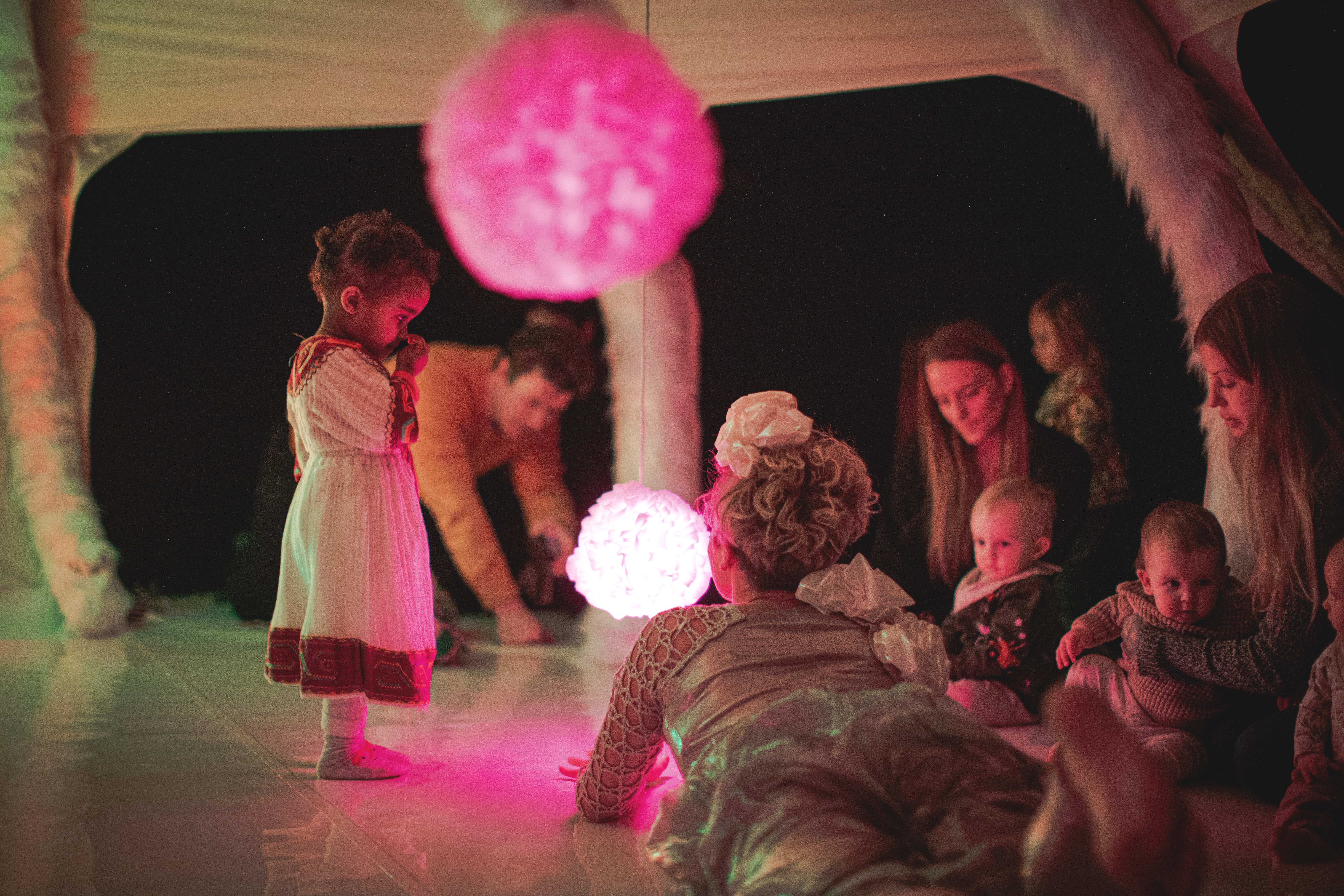 Här finns inga regler, vi är tillsammans i en värld av ljud, ljus och rörelse. Barnen får känna, lyssna, härma eller iaktta. Här finns mormors trasmattor, fårskinnet från barnvagnen och en förälders nynnande.
