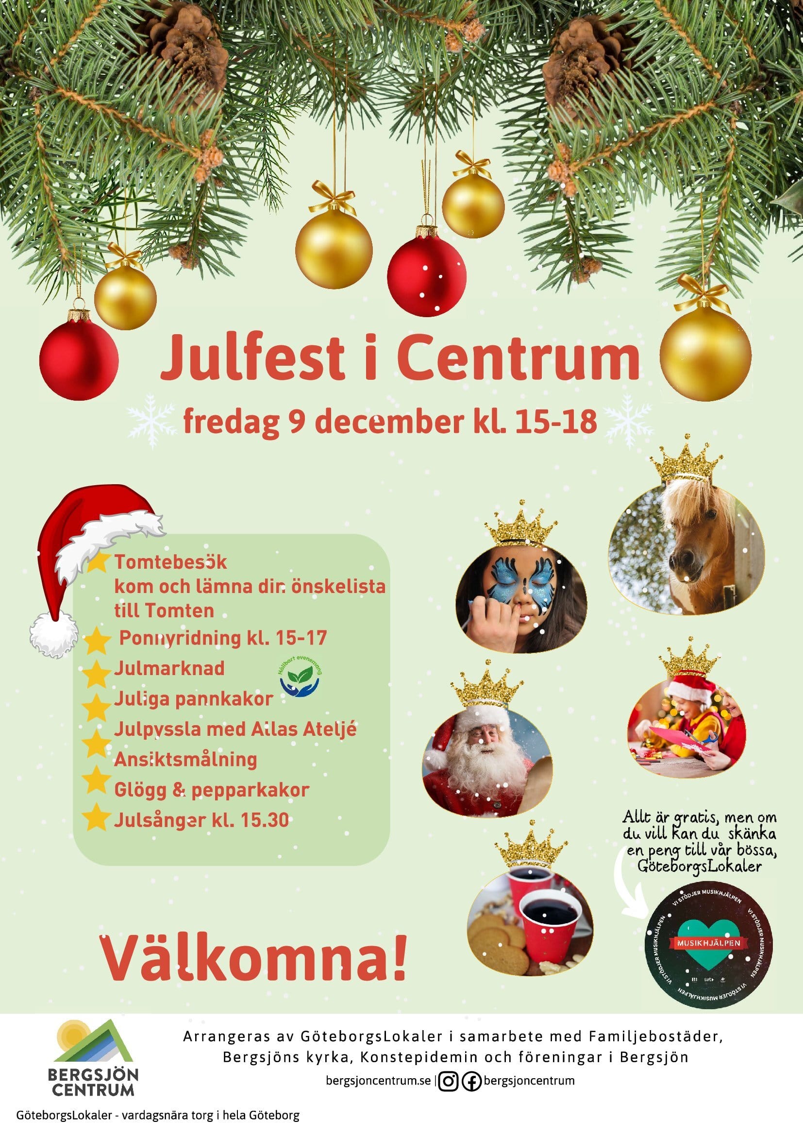 Allas Ateljé är med på Bergsjön Centrums härliga julfest! Det blir tomtebesök, ponnyridning, julmarknad, juliga pannkakor, glögg och pepparkakor och julsånger. Allas ateljé har bjudit in unga ledare som håller i julkortsdesign och ansiktsmålning.
