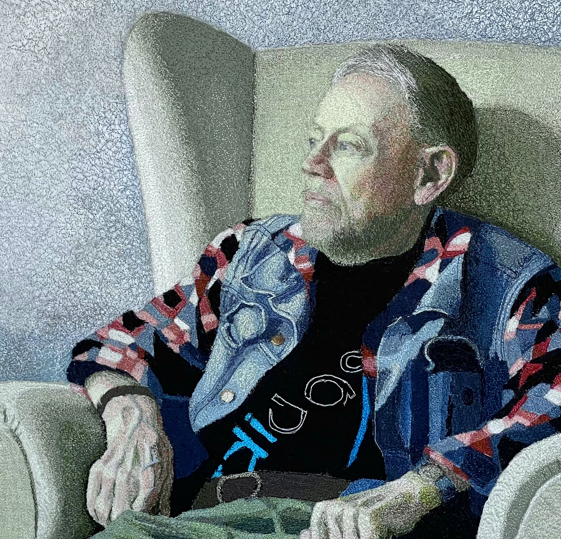 En kamera och en stabil analog symaskin från 1980-talet är mina verktyg. Processen börjar med att jag fotograferar motiv som intresserar mig, fotografierna ligger sedan som grund för omgestaltning till textila bilder. Genom att fälla ner mataren på symaskinen och sy med en speciell pressarfot för stoppsöm kan jag styra tyget fritt och ”måla” med tråden. Jag bygger upp motivet med tygbitar i olika färger, syr sedan i lager på lager för att få fram ljus och schatteringar. Jag fördjupar mig gärna i ett motiv åt gången och syr serier av bilder. På utställningen visar jag porträtt av människor i min omgivning, studier av lavar på Västkustens klippor och av gräs som låter sig fångas så fint av den tunna tråden.